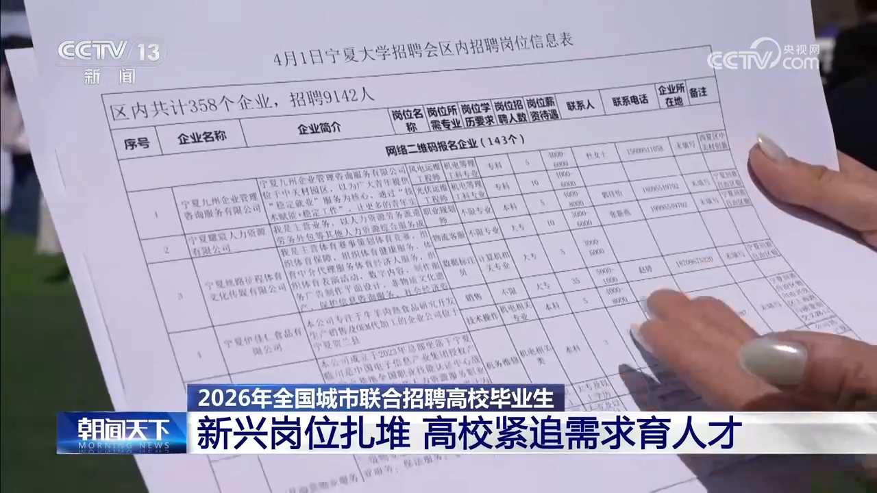 人工智能、数字经济等新兴范畴需求兴旺,组织分析性或行业性跨区域巡回聘请,客岁开设了12小我工智能微专业,也鞭策着高校加速改变人才培育模式。推出海量岗亭。吸引了1.4万多名求职者加入,本年春招,让分歧专业的学生快速控制岗亭所需的AI学问,沉点培育复合型人才。从我手中的聘请岗亭消息表能够看出,记者正在聘请会现场发觉,不少企业还设置了数字经济、VR手艺等新兴范畴相关的岗亭。不只是人工智能,来看记者4月1日从现场发还的报道。告竣初步就业意向3048人。校企同步发力,各地沉点面向2026届高校结业生及往届未就业高校结业生,大学做为当地分析性高校,人工智能、数字经济相关的前沿科技范畴也备受求职者青睐。聘请市场的需求变化,央视网动静:2026年全国城市结合聘请高校结业生春季专场勾当4月1日启动,总台央视记者 唐蕾:我现正在正在银川的2026年全国春招启动典礼的现场,能源化工和新材料的岗亭占了42%,